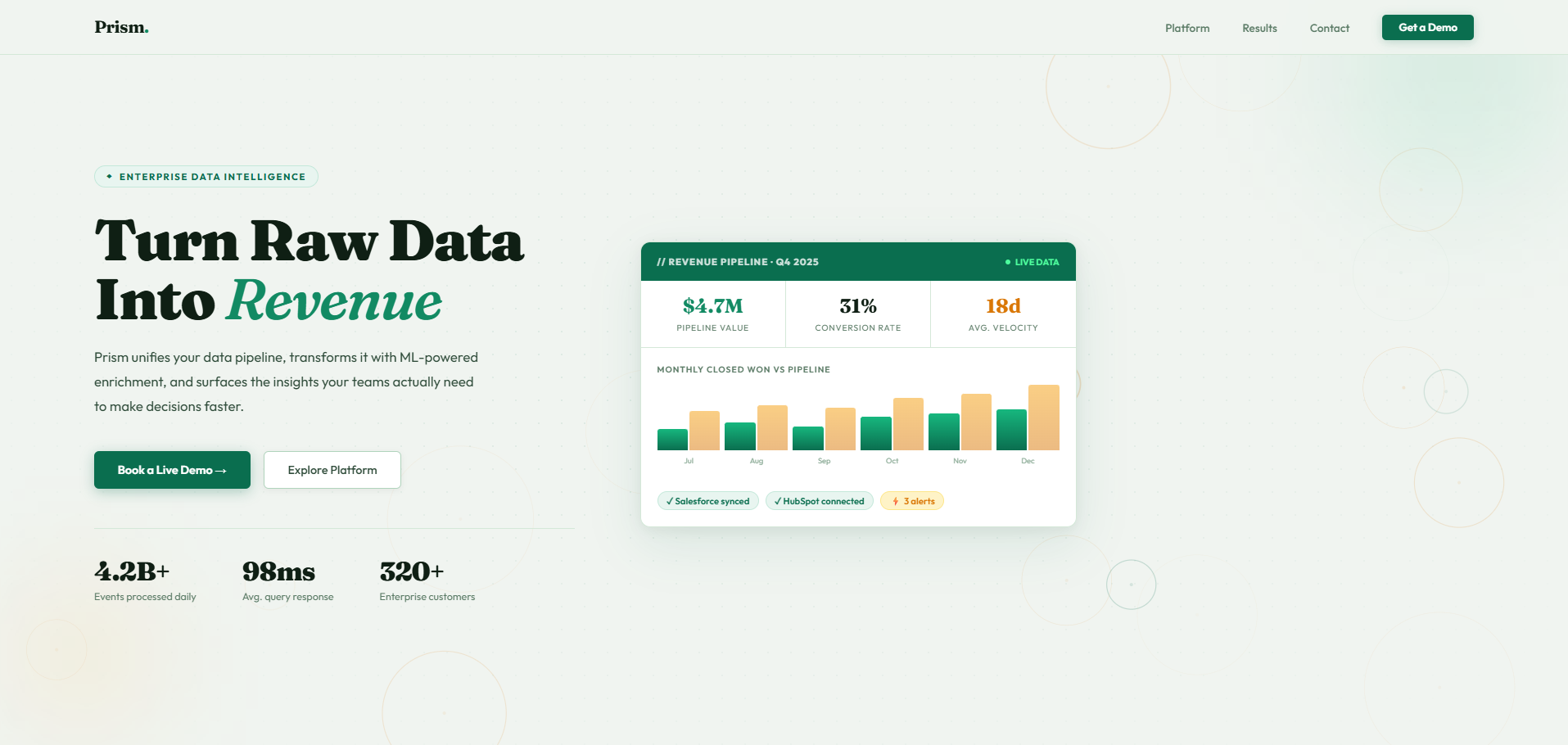 Prism unifies your data pipeline, transforms it with ML-powered enrichment, and surfaces the insights your teams actually need to make decisions faster.